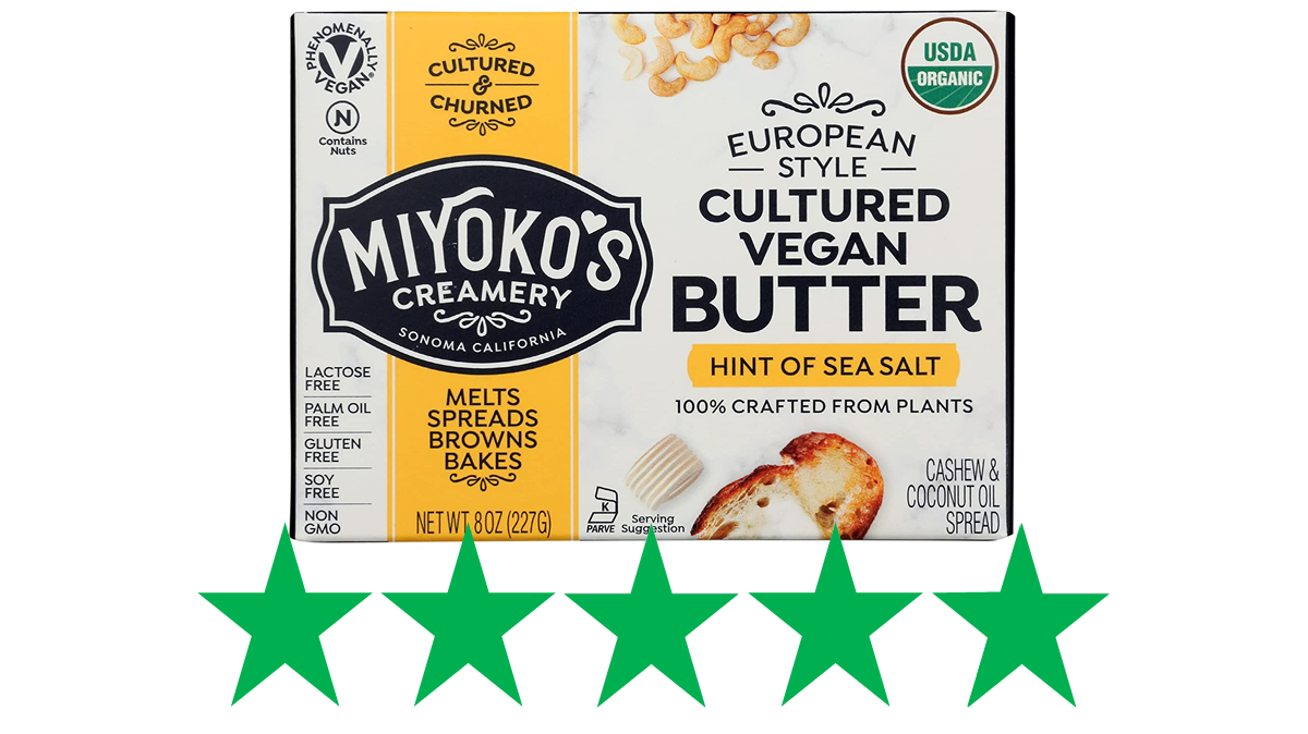 Miyoko’s European Style Cultured Vegan Butter raised the bar in the vegan dairy space. In terms of taste and texture, it’s my favorite vegan butter. Miyoko’s Creamery gets a perfect score of 5 Green Stars for social and environmental impact.