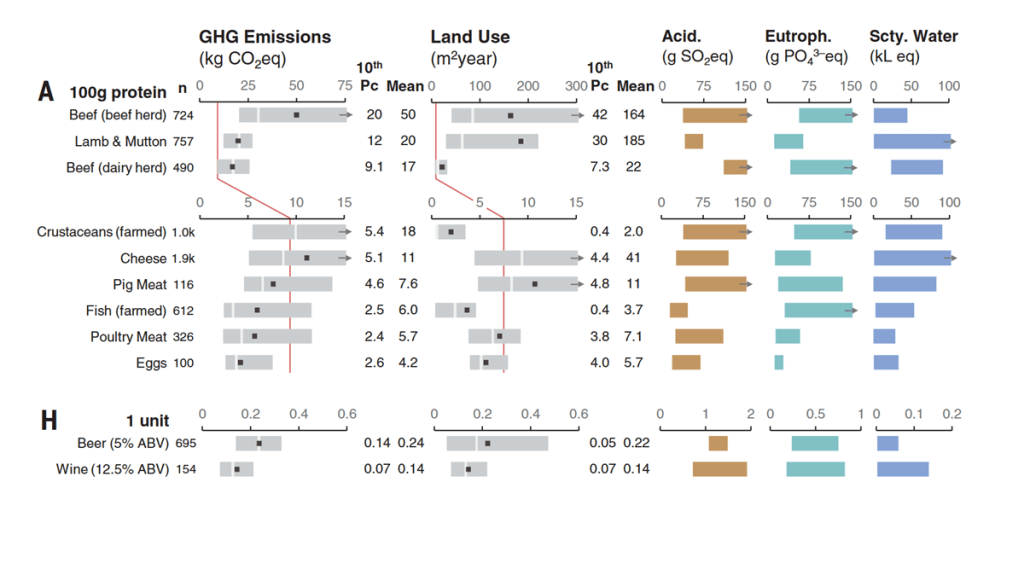 In order to appreciate this figure you have to notice that the numbers on the scales for beer and wine are much smaller to those for proteins, at the top. So, for example, GHGs for 100 g of protein from beef are 50 kg CO2 equivalents, on average, compared to only 0.14 kg CO2 equivalents for a glass of wine. In other words, the carbon footprint of a glass of wine is over 300 times lower than that of a serving of beef. The difference in land use is even bigger – the land footprint of wine is over 1000 times lower than that of beef. And the story is similar with the other three metrics.